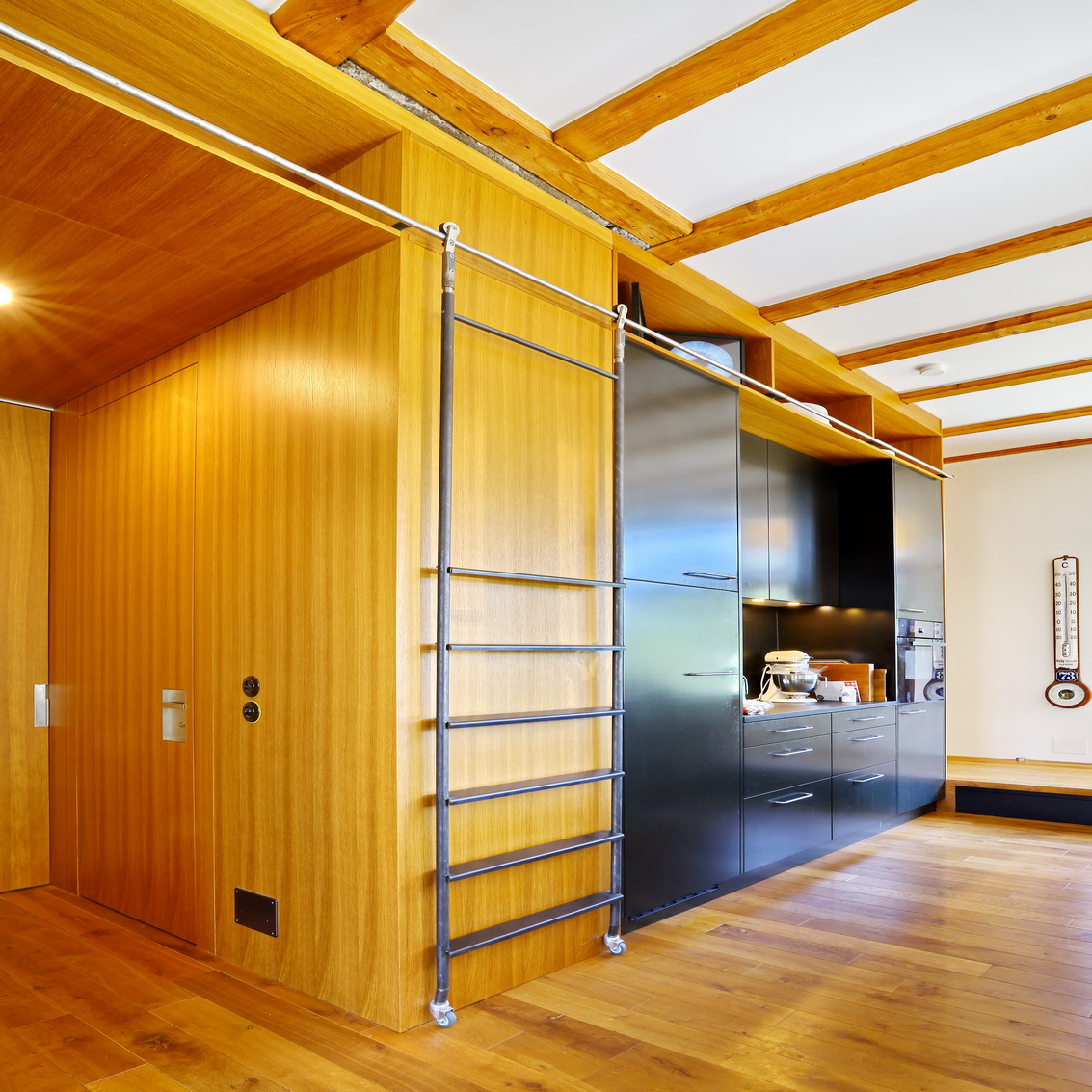 Ausgeführte Arbeiten: Küche, Schrankanlagen, Treppentritte, Wandverkleidung mit Beleuchtung